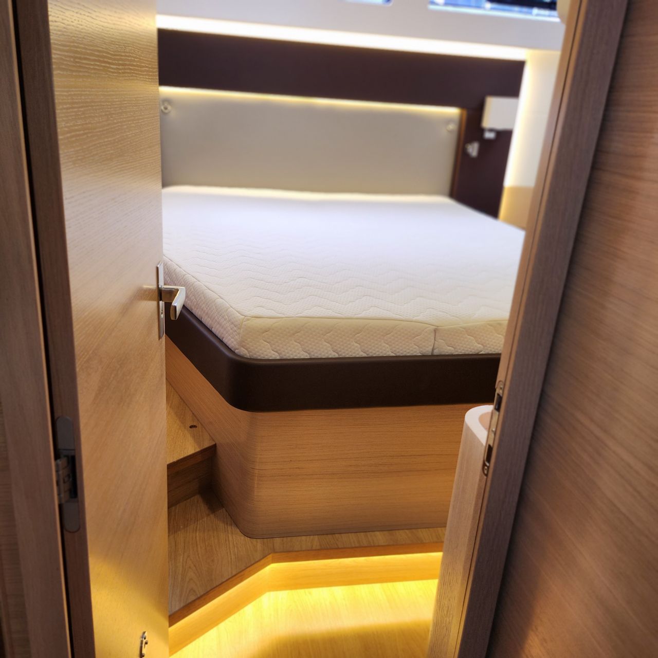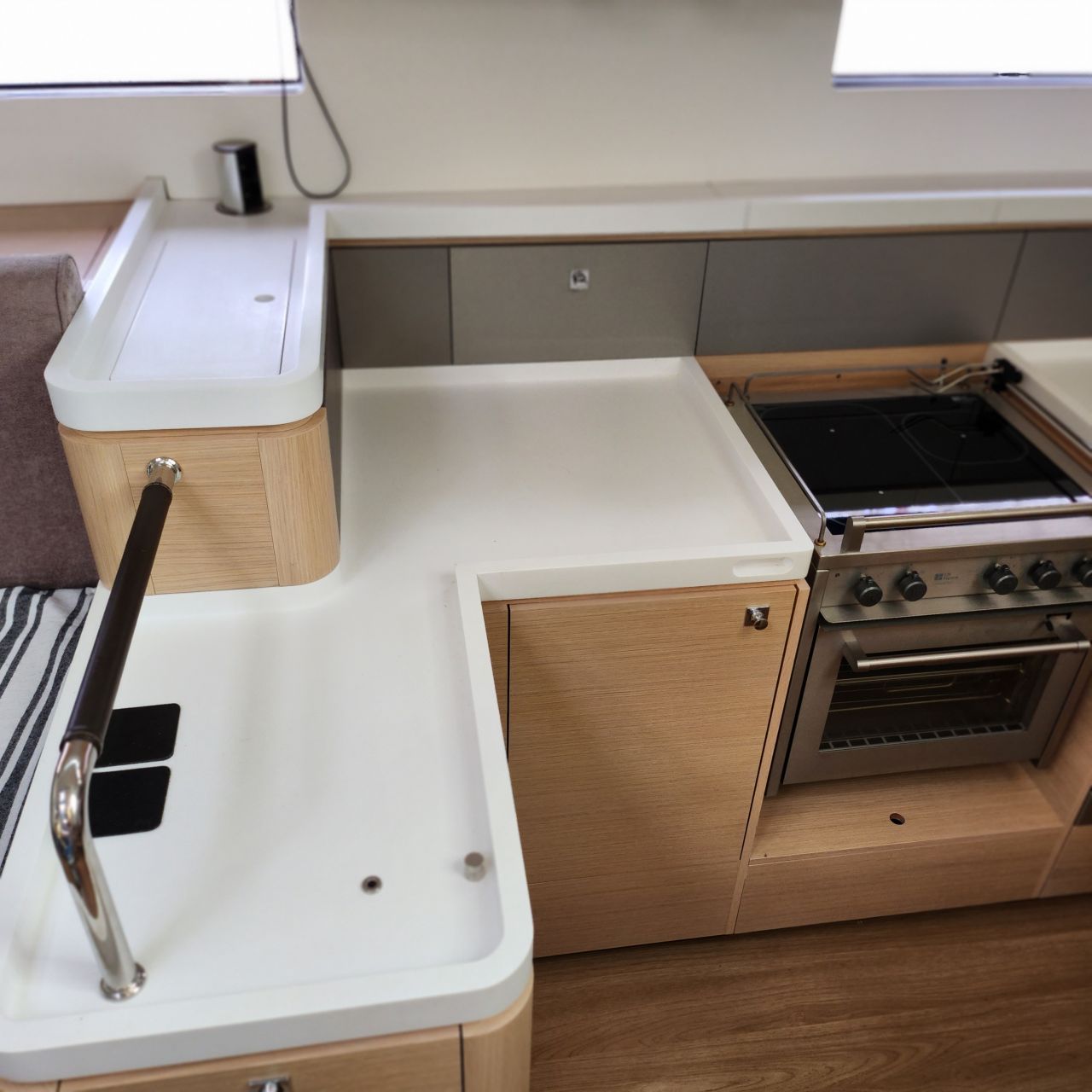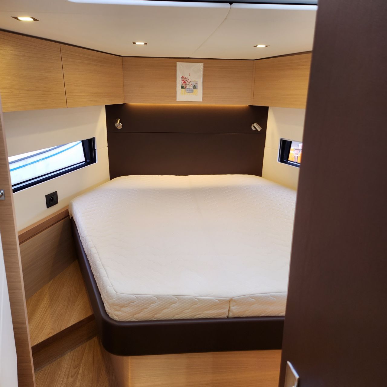 - Elektrischer Induktionsherd (3 Flammen und Backofen) - Luxuriöse, geräumige Eignerkabine im Heck mit breiter, freistehender Doppelkoje, Sessel und Schminktisch, Safe, reichlich Stauraum in Schränken, Fächern, Regalen und unter der Koje, die mit Gasdruckfedern hochgeklappt werden kann.