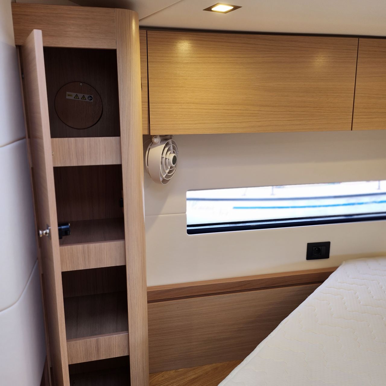 - AMEL 50 mit exklusivem, aufwendig ausgeführtem Ausbau in heller, seidenmatt lackierter Eiche mit weiß bespannten Panelen, laminierten Bodenbrettern und zahlreichen Lederapplikationen