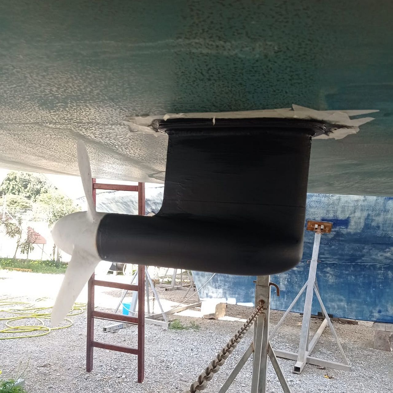 - Wellenanlage mit flexibler Kupplung AQUADRIVE, Faltpropeller GORI (mit Overdrive) und Leinenschneider auf der Propellerwelle