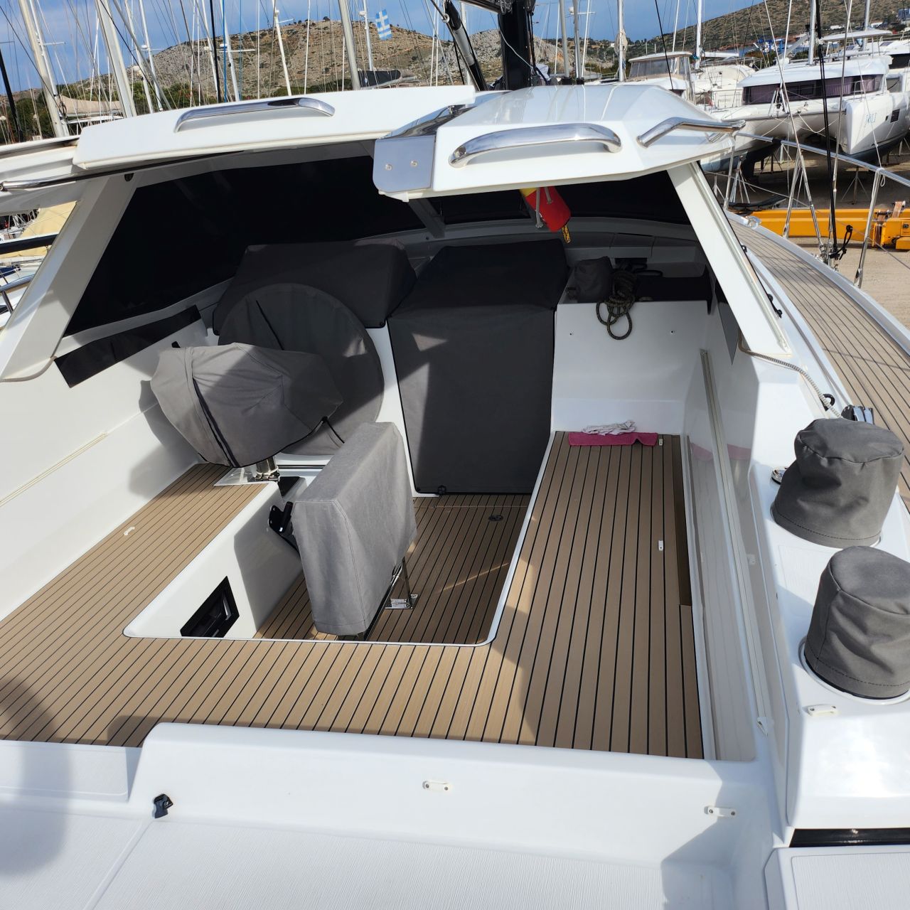 - Tiefes gut geschütztes Cockpit mit Steuerstand und Steuersitz an Backbord